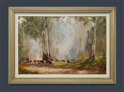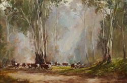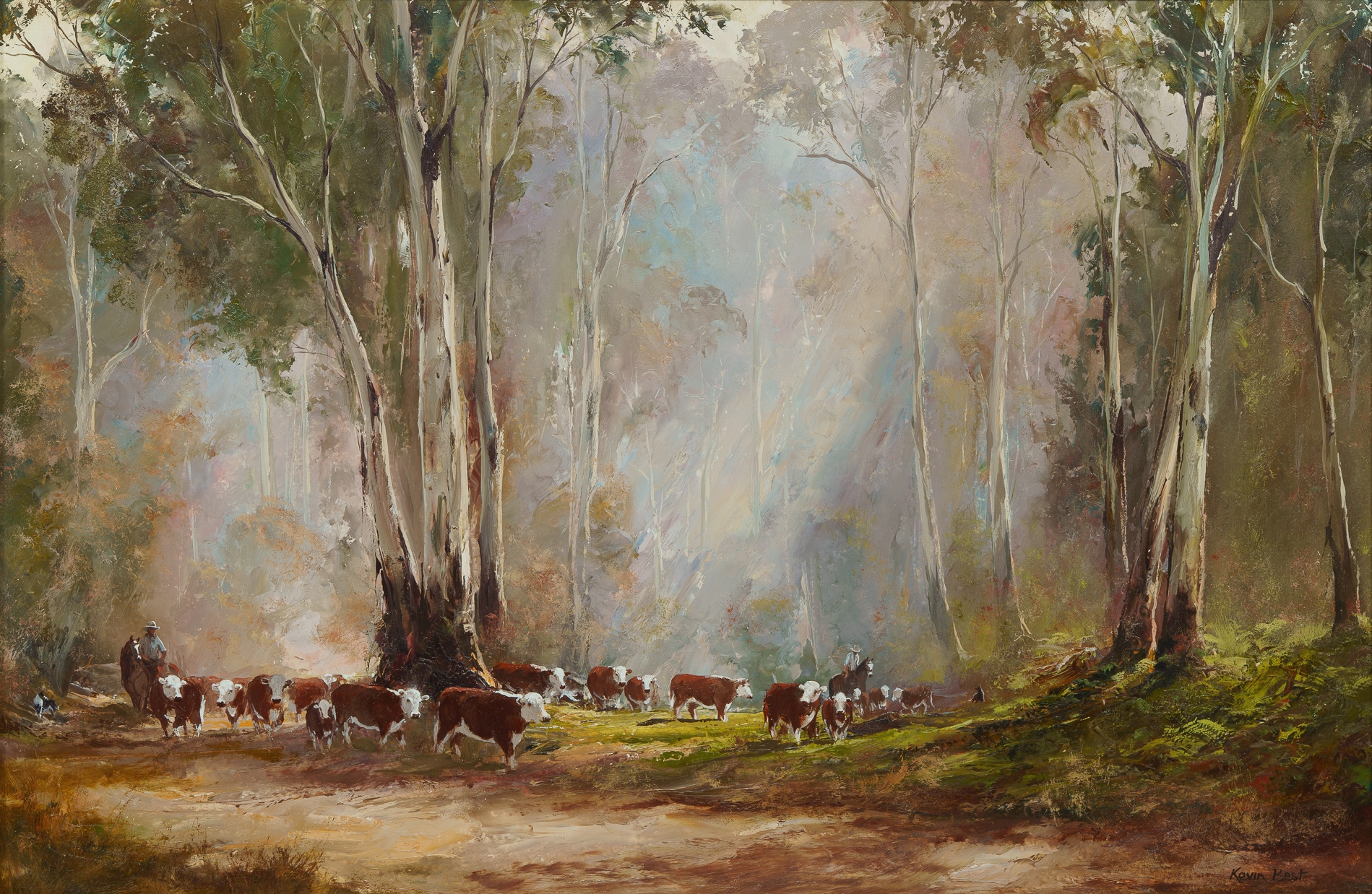 BEST, Kevin (1932-2012) 'Mustering in the High Country' Signed lower right; title label verso. Oil on Board 59x90cmEstimate $2,000-3,000