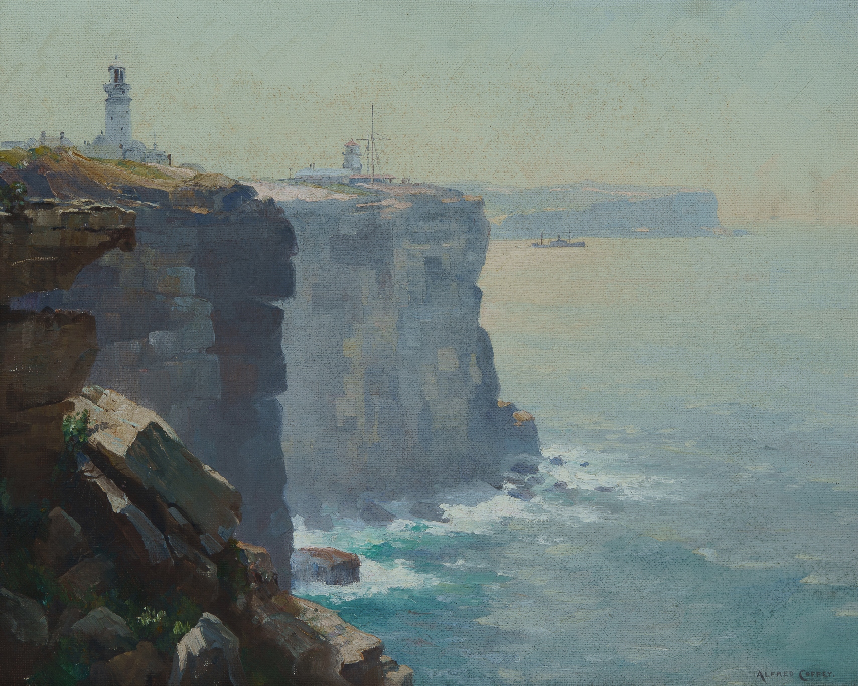 COFFEY, Alfred (1869-1950) Sydney Heads Signed lower right. Oil on Canvas Board 39x49cm PROVENANCE: The Fred and Elinor Wrobel Collection, Sydney.Estimate $800-1,500