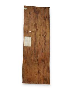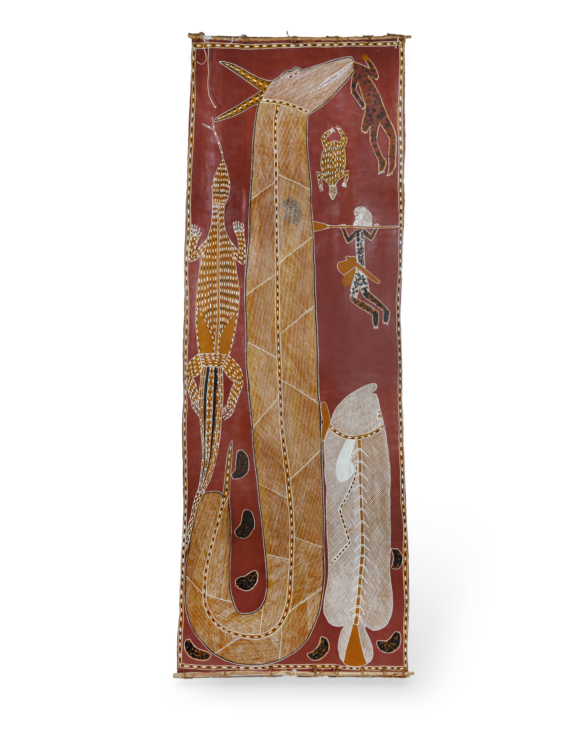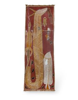 BUDUWAL, Bob (Aboriginal 1952) & YARINGURA, Lena (Aboriginal 1958) Borlung (Rainbow Serpent), 1989. Original Maningrida Arts & Crafts certificate verso (cat #BUL 28). Also signed verso 'Lena' upper centre "Borlung swallowed a Rembarrnga man..." Natural Earth Pigments on Bark 239x88cm